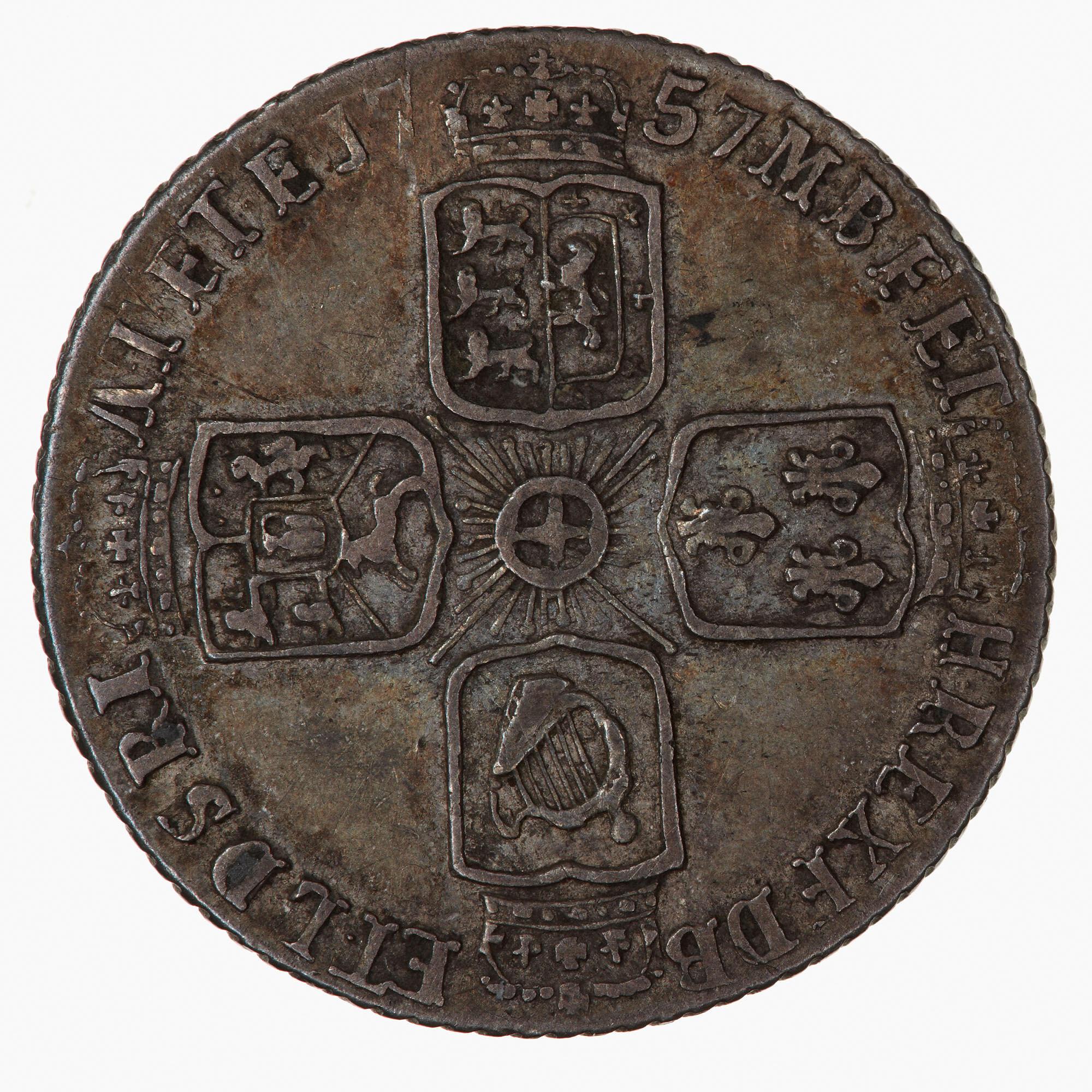 Four crowned shields arranged to form a cross, England and Scotland impaled, France, Ireland and the Electorate of Brunswick and Luneburg; Star of the Garter at the centre; around, M B F ET H REX F D B ET L D S R I A T ET E 1757, the date being broken by a crown. (Translation obverse and reverse: George II by the Grace of God King of Great Britain, France and Ireland, Duke of Brunswick and Luneburg, Archi-Thesaurius and Elector of the Holy Roman Empire).