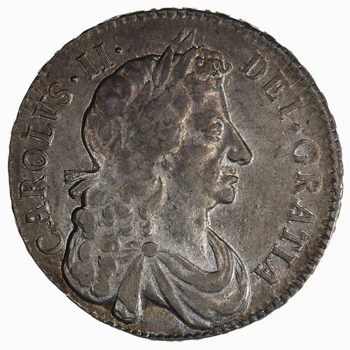 Laureate and draped bust of Charles II, facing right; around, CAROLVS . II . DEI . GRATIA