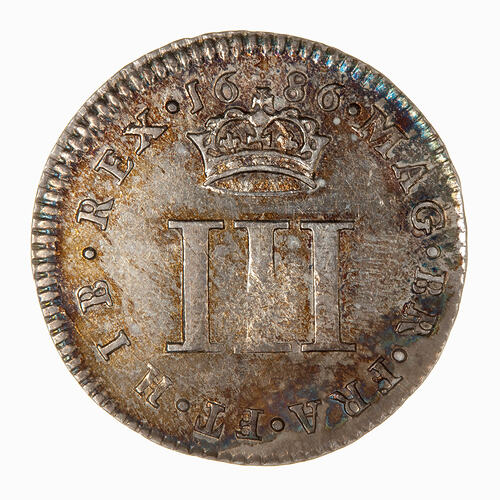 At centre, below a crown, the Roman numeral III; around, MAG BR FRA ET HIB REX 1686