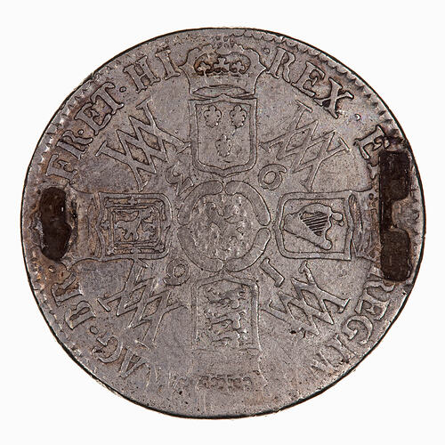 The crowned shields of England, Scotland, France and Ireland forming a cross shape around the arms of Nassau at the centre; in the angles between the shields, the monogram WM above a numeral of the date 1693; around, MAG BR FR ET HIB REX ET REGINA
