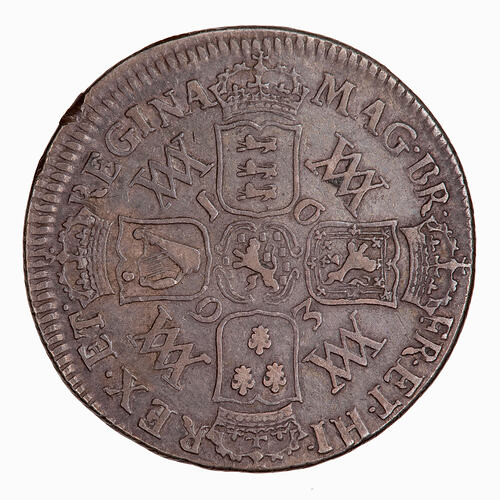Crowned shields of England, Scotland, France and Ireland forming a cross shape around the arms of Nassau at the centre; in the angles between the shields, the monogram WM above a numeral of the date 1693; around, MAG BR FR ET HI REX ET REGINA.