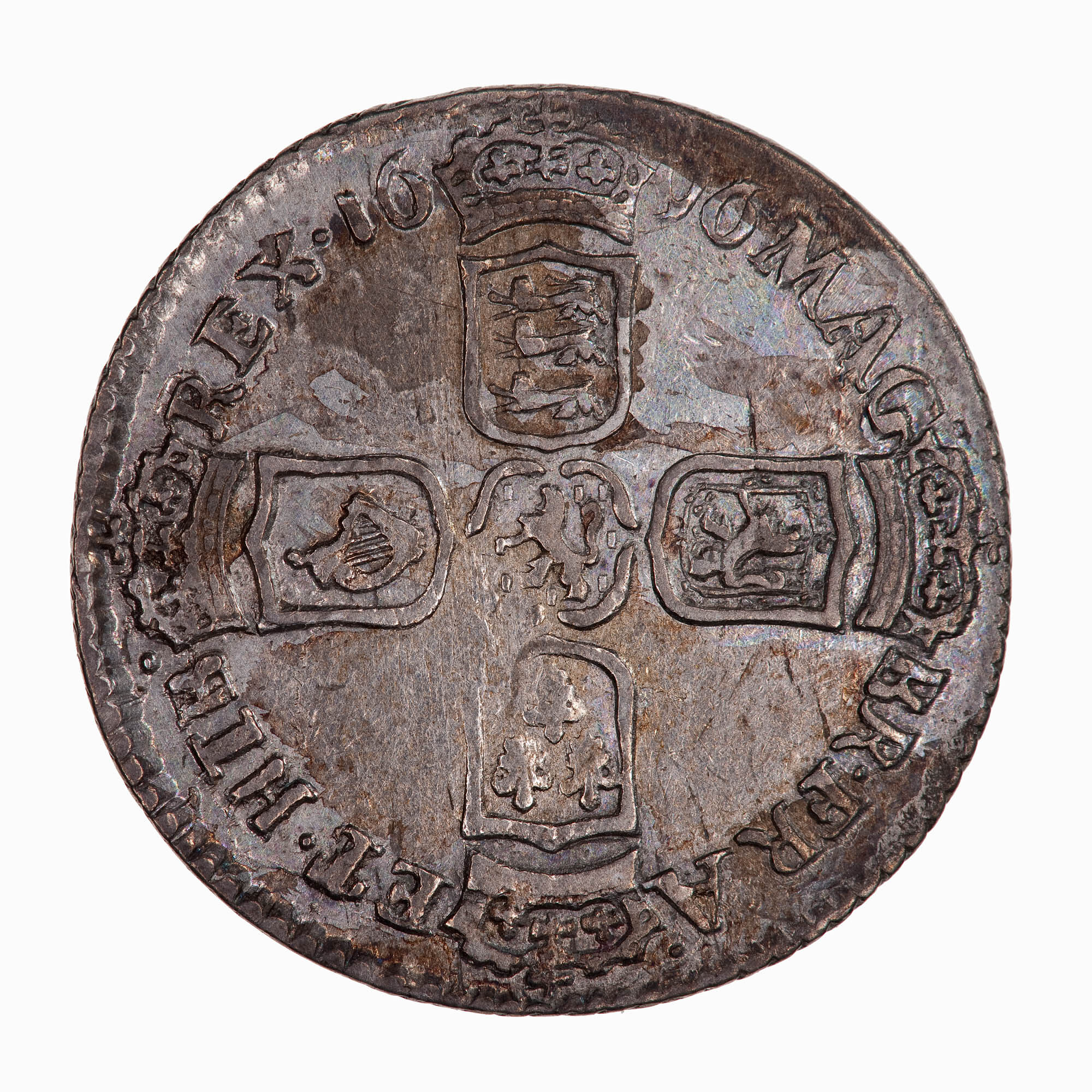 Crowned shields (large crown type) of England, Scotland, France and Ireland (early harp type) forming a cross shape around the arms of Nassau at the centre; around, MAG BR FRA ET HIB REX 1697, the date being divided by the crown over the shield of England.