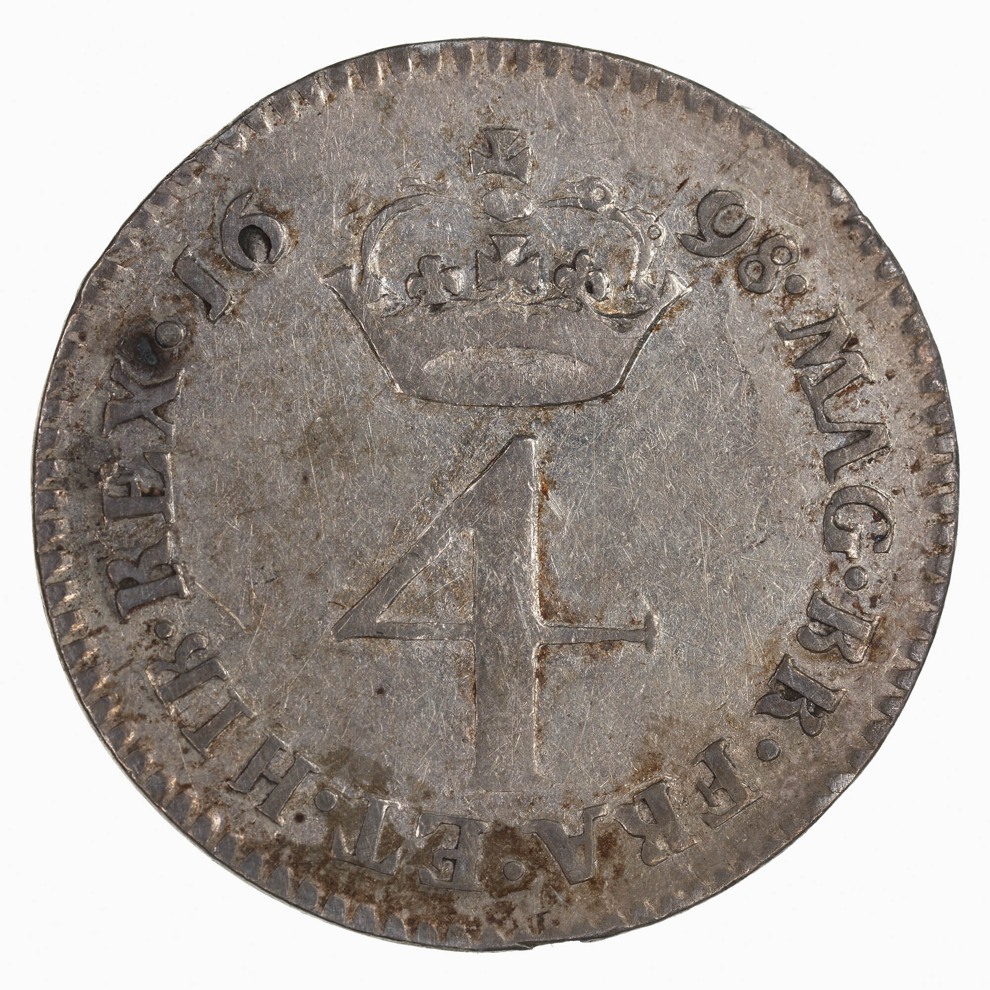 Crowned numeral 4; around, MAG BR FRA ET HIB REX 1698, the date being divided by the crown