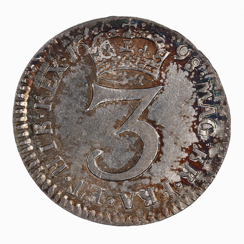 Crowned numeral 3; around, MAG BR FRA ET HIB REX 1698, the date being divided by the crown