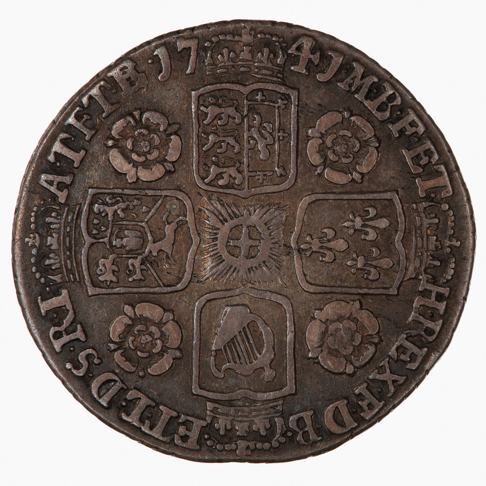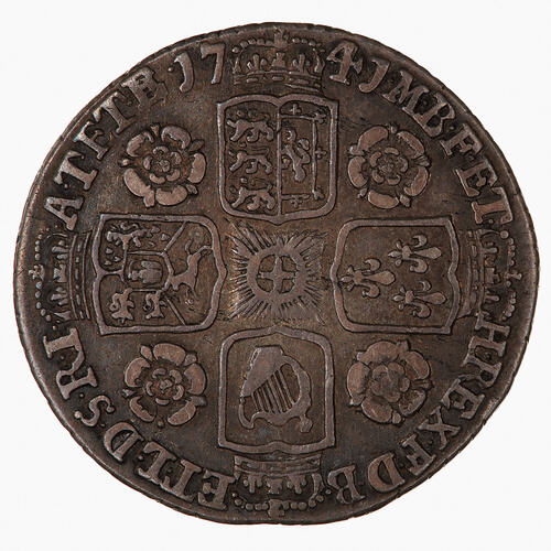 Four crowned shields arranged to form a cross, England and Scotland impaled, France, Ireland and the Electorate of Brunswick and Luneburg; Star of the Garter at the centre; a rose in each angle; around, M B F ET H REX F D B ET L D S R I A T ET E 1741, the date being broken by a crown. (Translation obverse and reverse: George II by the Grace of God King of Great Britain, France and Ireland, Duke of Brunswick and Luneburg, Archi-Thesaurius and Elector of the Holy Roman Empire).