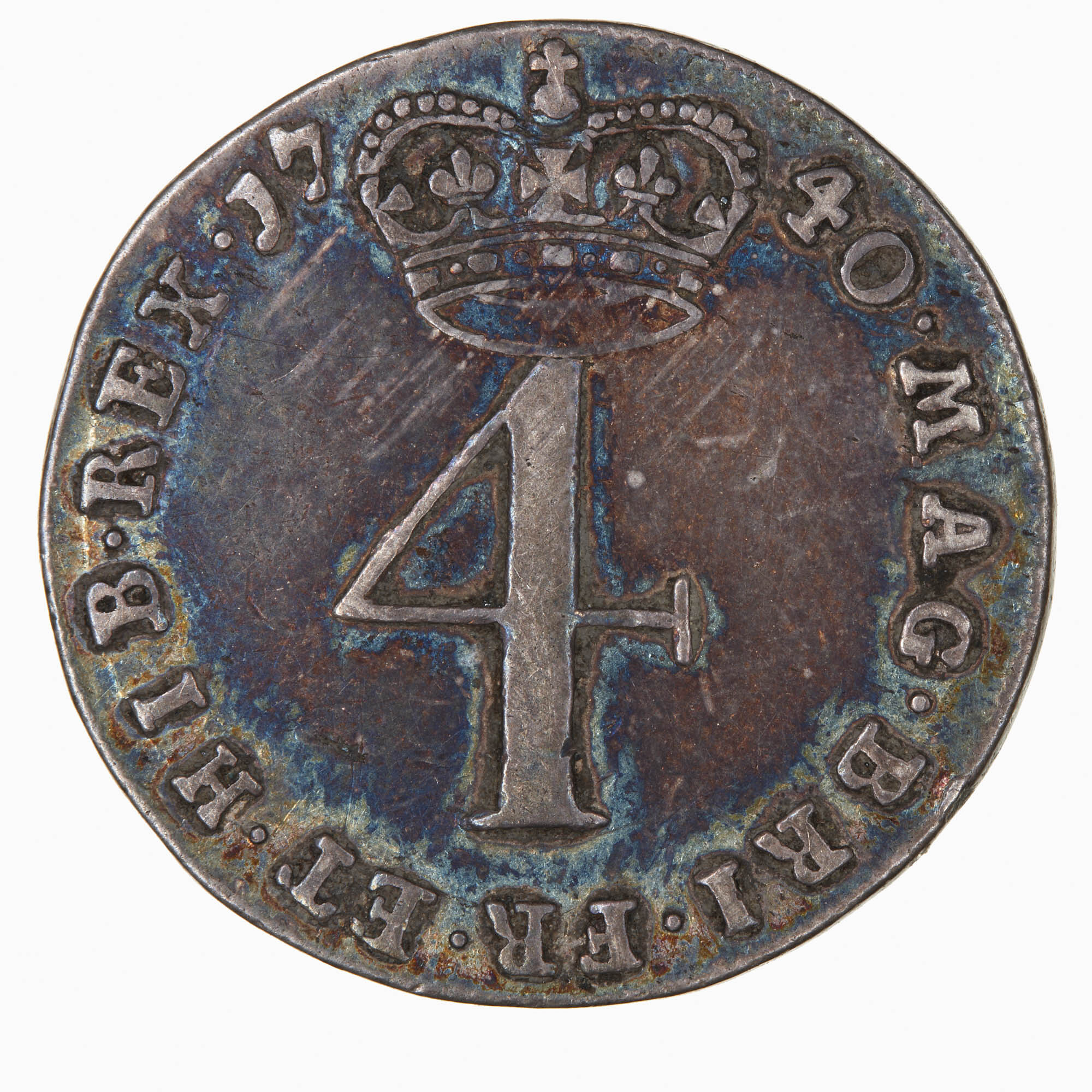 At centre, the numeral 4 crowned; around, MAG BRI FR ET HIB REX 1740; the date divided by the crown.
