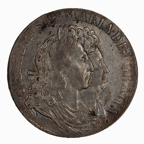 Conjoined busts of William & Mary right; William laureate; around, GVILELMVS . ET . MARIA . DEI . GRATIA