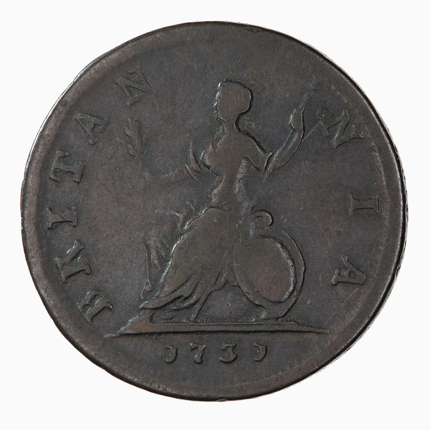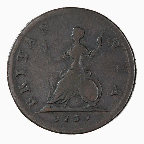 Britannia seated facing left on globe, extending olive branch and holding spear, by her side rests a shield decorated with the combined crosses of St. George and St. Andrew; around, BRITANNIA.; in exergue, 1731