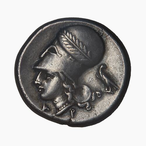 Head of Athena wearing a Corinthian helmet bound with olive wreath, facing left; in field behind, an eagle; below, the Greek letters A P.