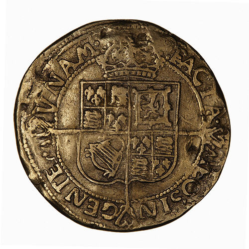 Crowned Royal shield quartered with the arms of England and France in the first and fourth quarters, Scotland and Ireland on a cross fleury; around, FACIAM EOS IN GENTEM UNAM (translation: I will make them one nation)