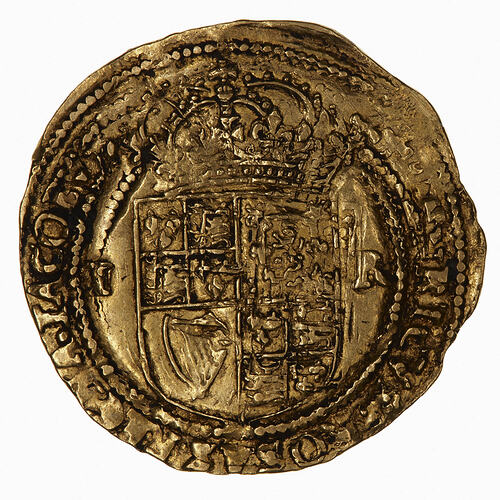 Crowned shield dividing the letters I R; the shield is quartered with the joint arms of England and France (1 & 4), Scotland (2) and Ireland (3); around, (mm trefoil) HENRICVS ROSA REGNA IACOBVS (translation, Henry united the roses, James the kingdoms)
