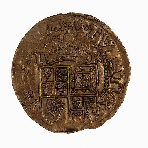 Crowned shield, the crown dividing the letters I R; the shield is quartered with the joint arms of England and France (1 & 4), Scotland (2) and Ireland (3); around, (mm lis) TVEATVR VNITA DEVS (translation, may god guard these united kingdoms)