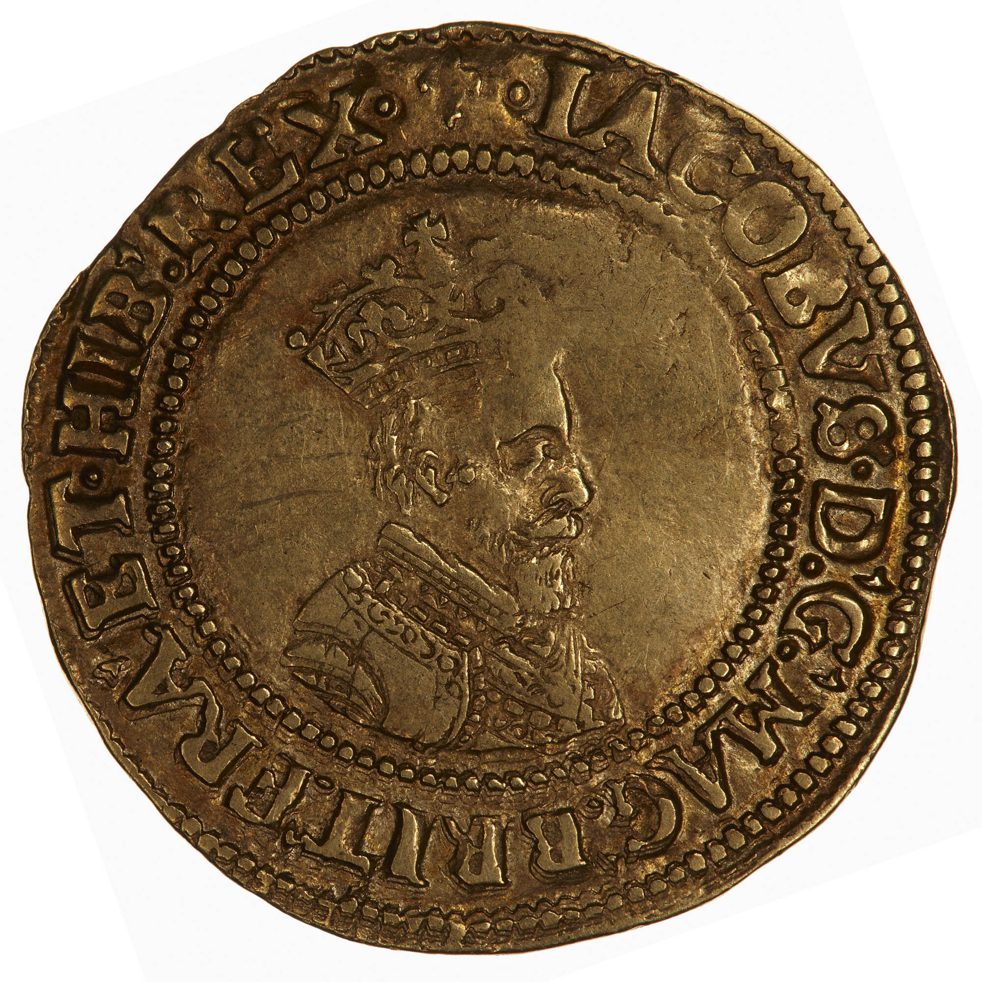 Crowned bust of the King facing right wearing lace collar and decorated armour; around, (mm lis) IACOBVS D G MAG BRIT FRAN ET HIB REX