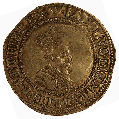 Crowned shield, the crown dividing the letters I R; the shield is quartered with the joint arms of England and France (1 & 4), Scotland (2) and Ireland (3); around, (mm lis) HENRICVS ROSAS REGNA IACOBVS (translation, Henry united the roses, James the kingdoms)