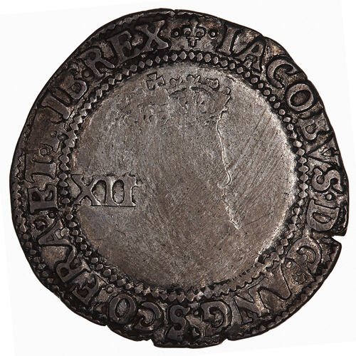 Within an inner beaded circle, a crowned bust of the King facing right; behind, the Roman numeral XII; around, (mm lis) IACOBVS D G ANG SCO FRA ET HIB REX