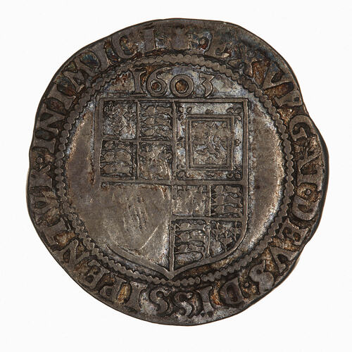 At centre within a circle of beads, square topped shield bearing the Royal Arms; above, 1603; around, (mm. thistle) EXVRGAT DEVS DISSIPENTVR INIMICI (translation, let God arise let his enemies be scattered)