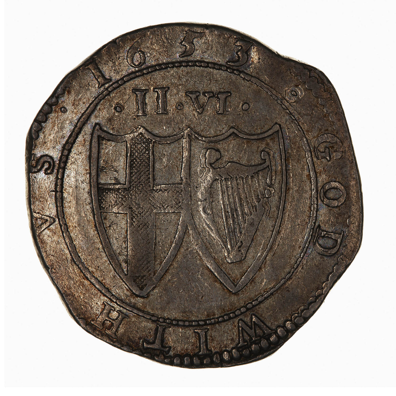 Within a beaded inner circle two conjoined shields, the one on the left bearing the cross of St. George and on the right, the Irish Harp; above, the denomination in shillings, .II.VI.; around, GOD WITH VS 1653