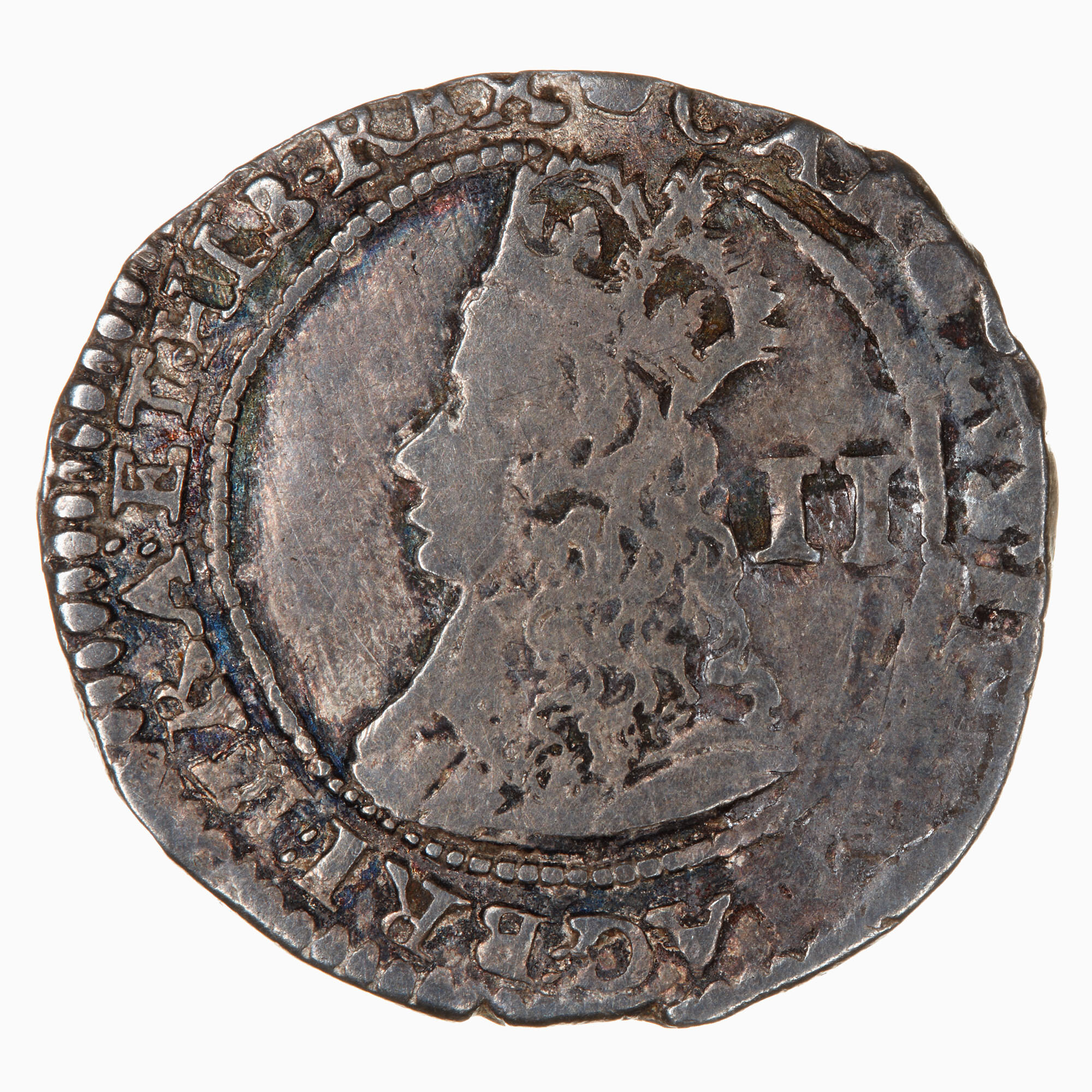 Within an inner circle, a square topped shield quartered with the arms of England and France combined (in 1st and 4th quarters), Scotland and Ireland, on a cross fleury; around, (mm. crown) C[HRISTO . A]VSPICE . REGNO . (translation: I reign under the auspices of Christ)