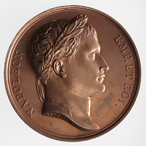 Laureate head facing right; around, NAPOLEON EMP. ET ROI.; on neck truncation, ANDRIEU F.
