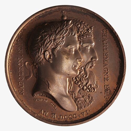Conjoined heads of Napoleon, laureate, and Charlemagne, crowned; at left, NAPOLEON . EMP.; at right, CHARLEMAGNE. EMP.; below, AN M.DCCC.VI.; on head truncation, ANDREIU. F.; below in small lettering, DENON DIR.