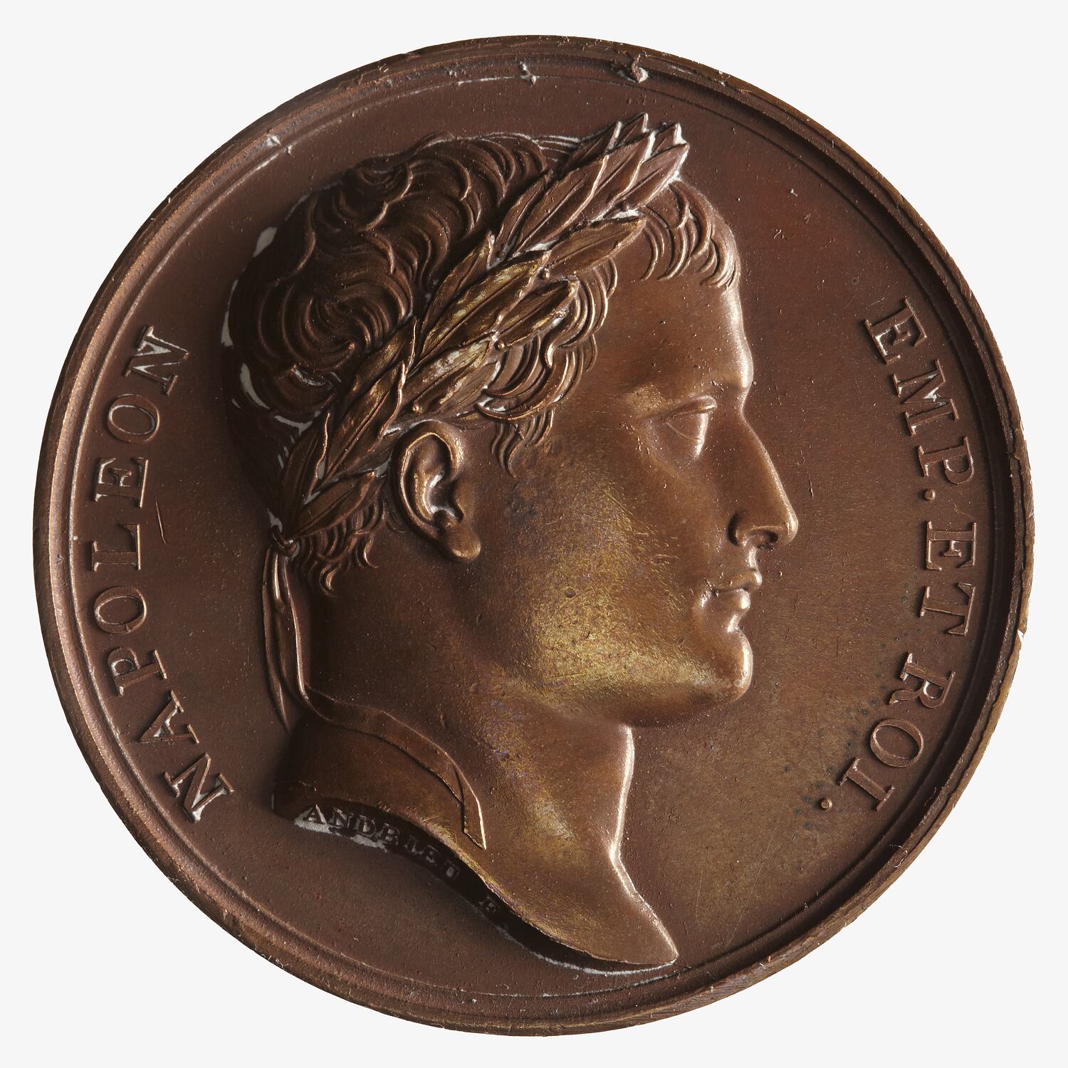 Laureate head facing right; around, NAPOLEON EMP. ET ROI.; on neck truncation, ANDRIEU F.
