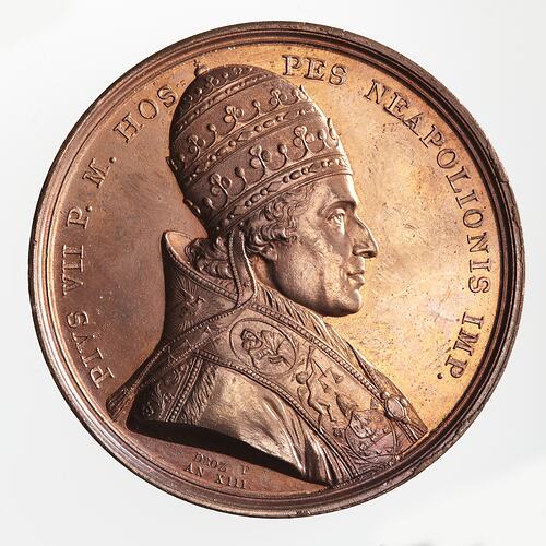 Bust of Pope Pius VII in his Sacerdotal habit, the Papal tiara on his head. Legend, PIUS VII. P. M. HOSPES NEAPOLIONIS IMP. ; below DROZ.F