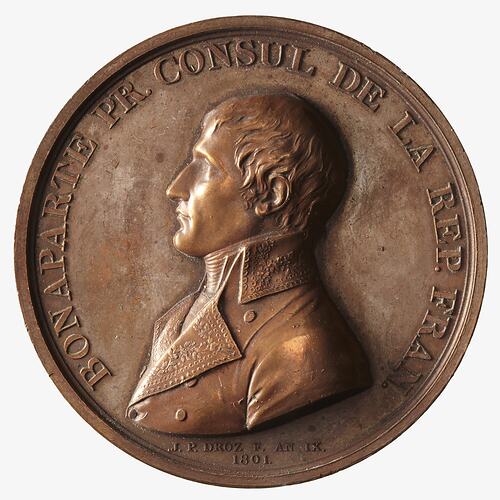 Long bust of Bonaparte, head bare, facing left; around, BONAPARTE PR. CONSUL DE LA REP. FRAN.; below bust in small lettering, J.P. DROZ F. AN XI. / 1801.