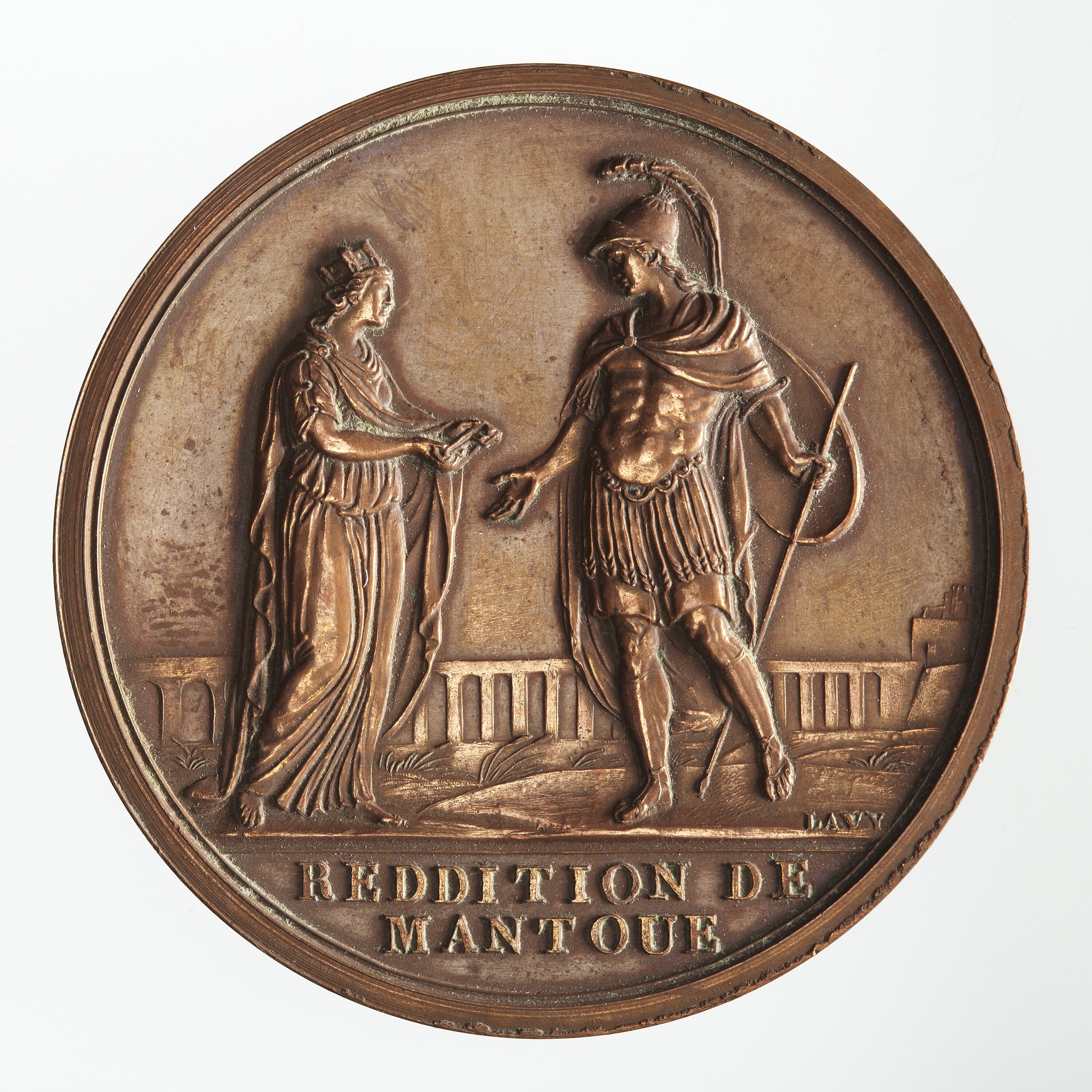 The personification of Mantuawearing a mural crown standing facing left presents the city key to a Roman soldier wearing a Corinthian helmet and holding a shield and spear; in the background, an aqueduct leading to the city walls; in exergue, REDDITION DE MANTOUE; the artist's name, LAVY, at right of exergue line