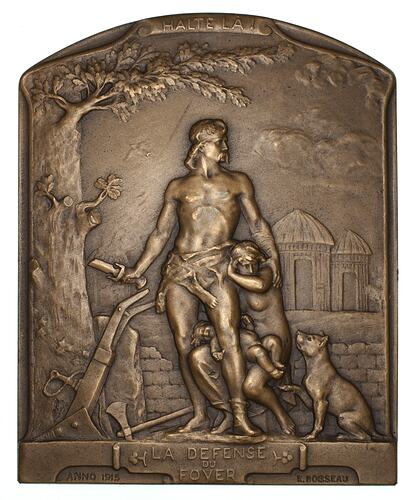 Obverse inscription: "HALTE LA! / LA DEFENSE DU FOYER". (Stop! / Defense of the Home). "ANNO 1915 / E. BOISSEAU" (Year 1915 / E. Boisseau (artist)".