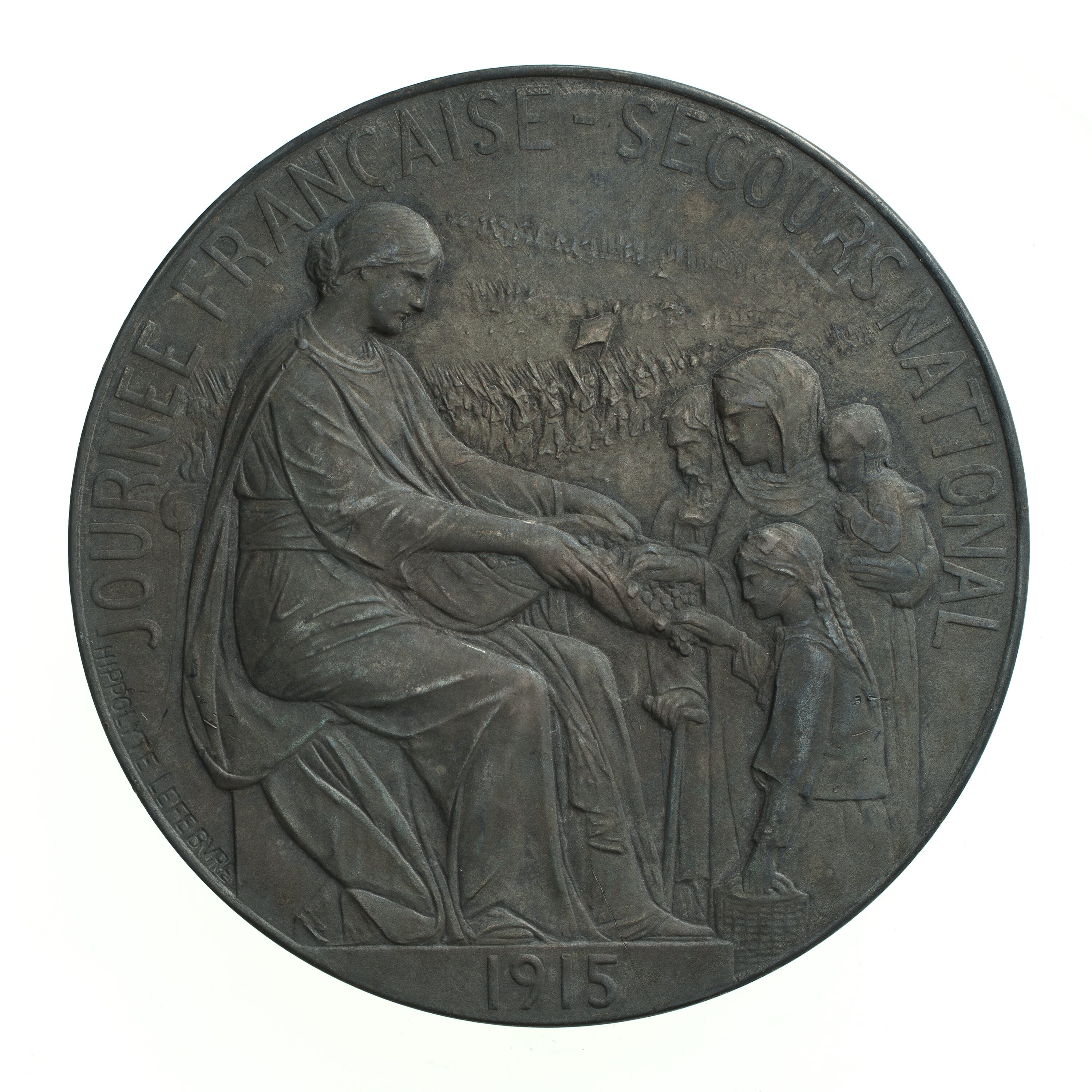 Obverse inscription: "JOURNEE FRANCAISE SECOUR NATIONAL / 1915" (French Day of National Aid / 1915). Artist's name "HIPPOLYTE LEFEBVRE" along lower left edge. Reverse Inscription: "PATRIE" (Homeland).