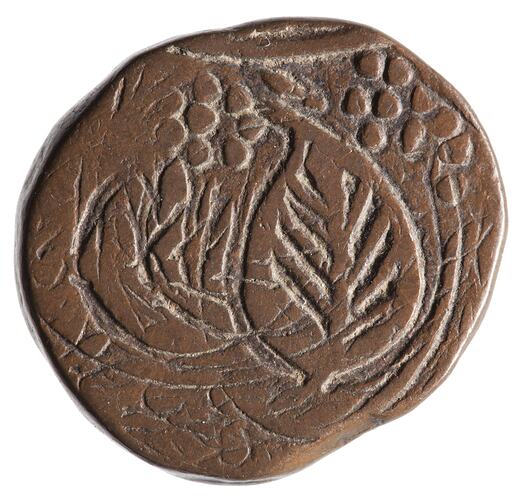 A leaf within a Persian legend, date off flan; (Valentine gives the legend as Zarb Jamun sambat (date)) Flan has rotated 90 degrees and been double struck