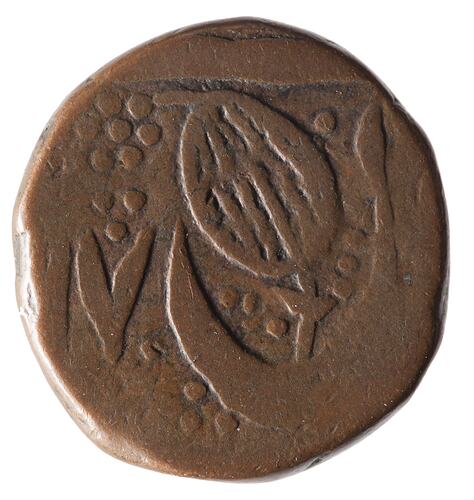 A leaf within a Persian legend (mostly off flan), numeral IV (17) of date on left edge of flan; (Valentine gives the legend as Zarb Jamun sambat (date))