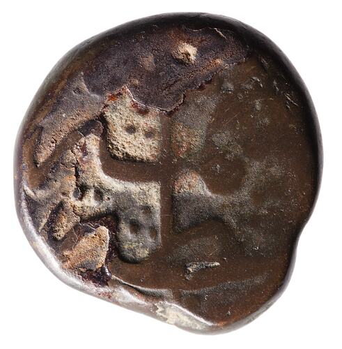 Inscription in Persian, mostly off flan (Valentine gives: Ya Shah Nur al din ya makdum with the translation: Oh! Shah Nur al din Oh! Master)