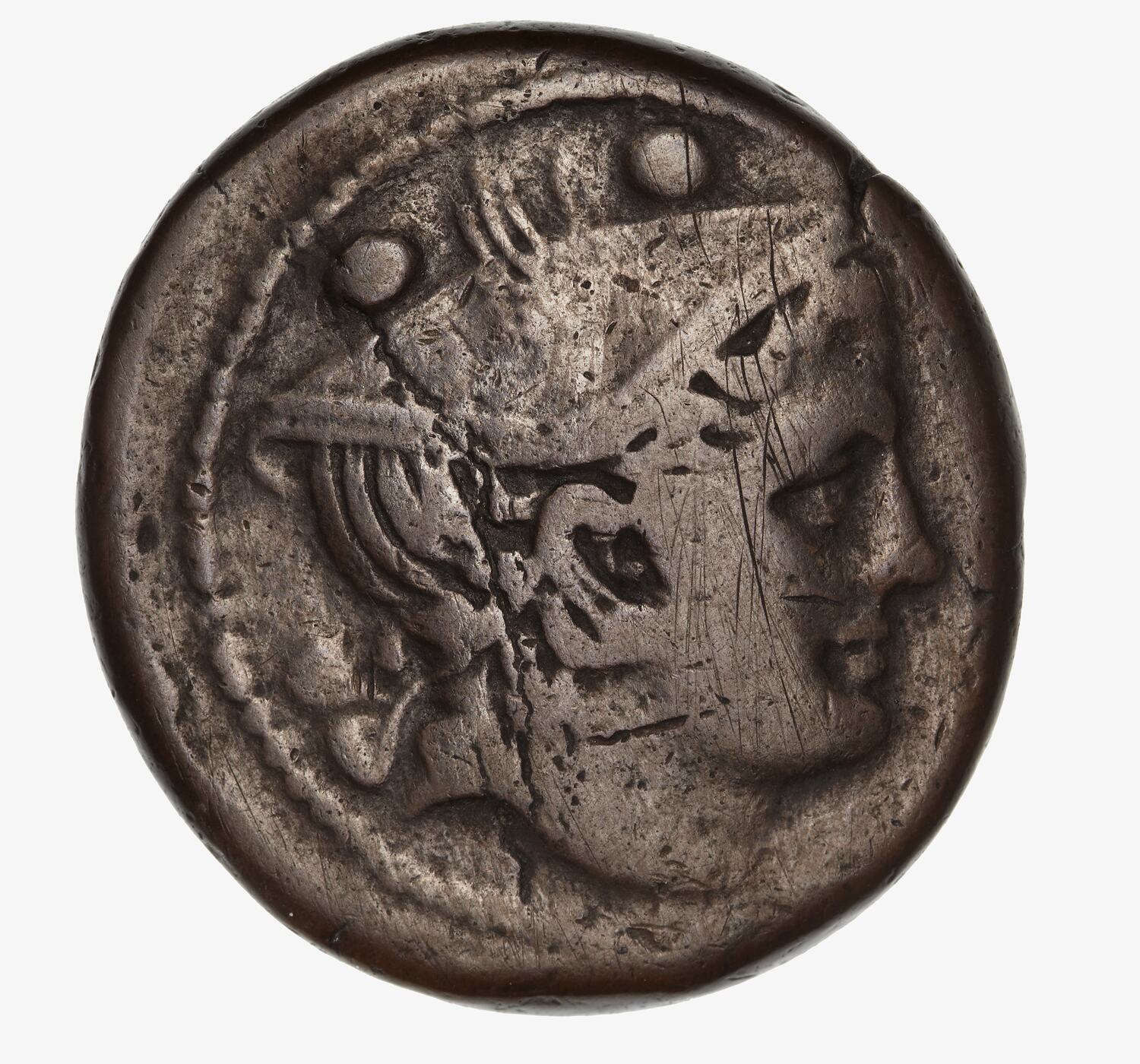 Head of the god Mercury wearing a winged petasus facing right; above, two beads, border of beads