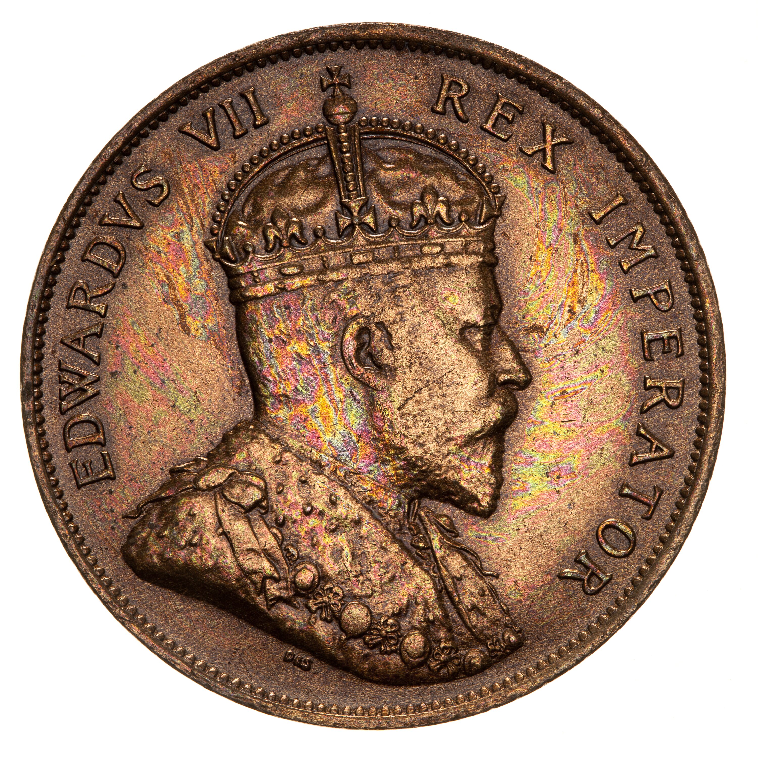Crowned and draped bust of the King facing right, the King is wearing the Imperial Crown and the ermine Robe of State, the Collar of the Most Honourable Order of the Bath; around, EDWARDVS VII REX IMPERATOR; below the bust truncation, the artist's initials, DES