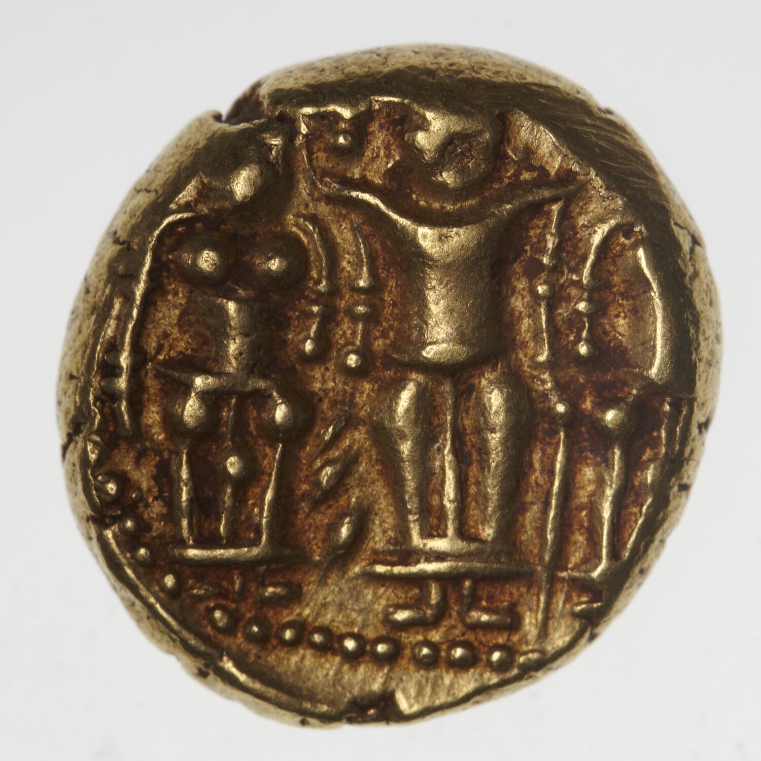 The right to strike gold pagodas was granted in 1639. From about 1678 a granulated reverse, based on the Dutch pagoda of the same date, was employed. This type, with three figures on the obverse, was introduced in about 1691 and retained until replaced by the star pagoda in 1740.