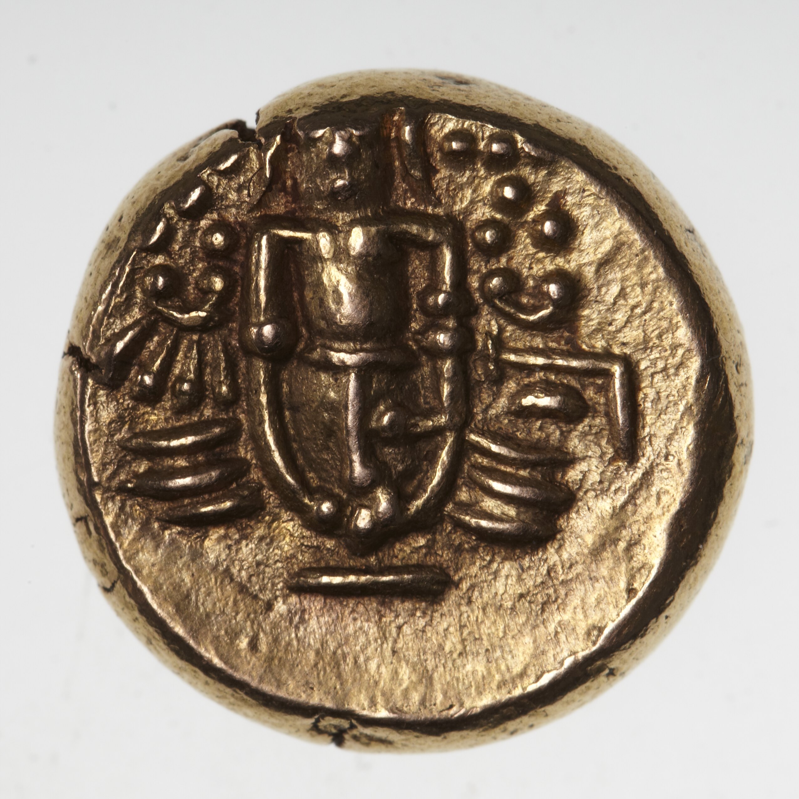 The right to strike gold pagodas was granted in 1639. From about 1678 a granulated reverse, based on the Dutch pagoda of the same date, was employed. This type, with one figure on the obverse, was introduced in about 1678 and retained until replaced by the star pagoda in 1740.
