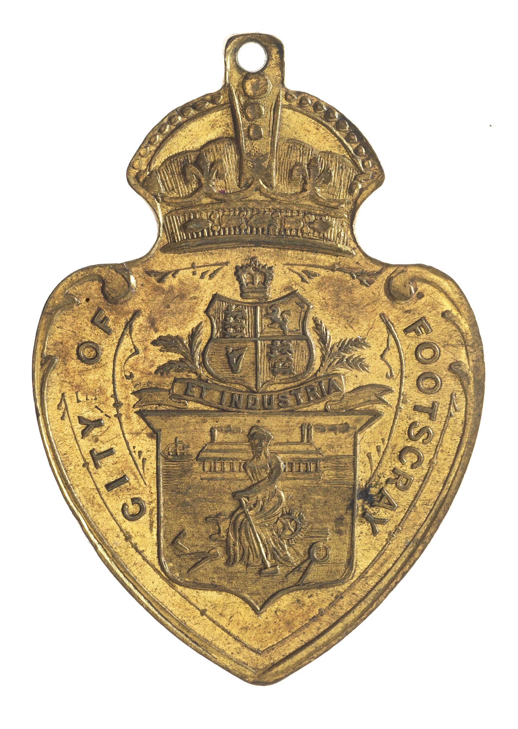 On shield, woman siting in front of factory and surrounded by work tools, above, arms of Great Britain over ribbon with motto, ET INDUSTRIA; around, CITY OF FOOTSCRAY