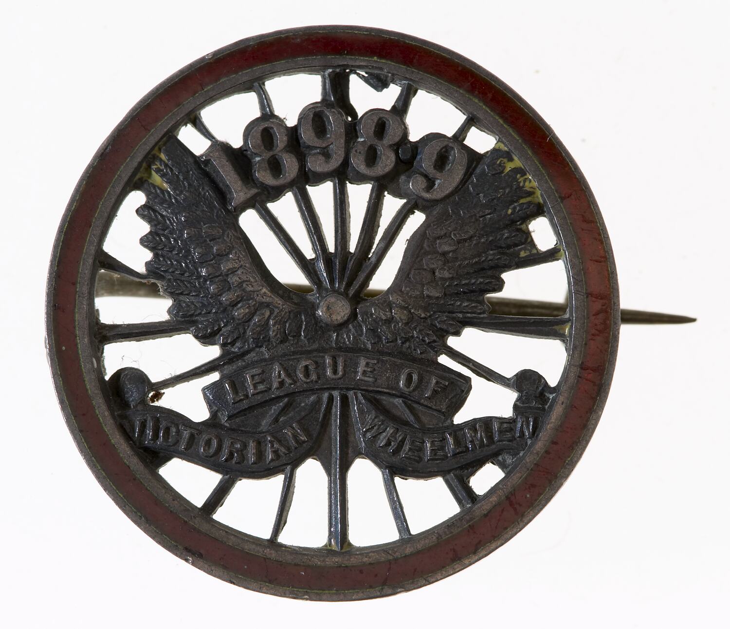 Plain (edge) A bicycle wheel with tyre enameled dark red, wings from hub support 1898.9; below on ribbon, LEAGUE OF / VICTORIAN WHEELMEN (obverse) Pin clip for wearing, stamped, 425 (reverse)