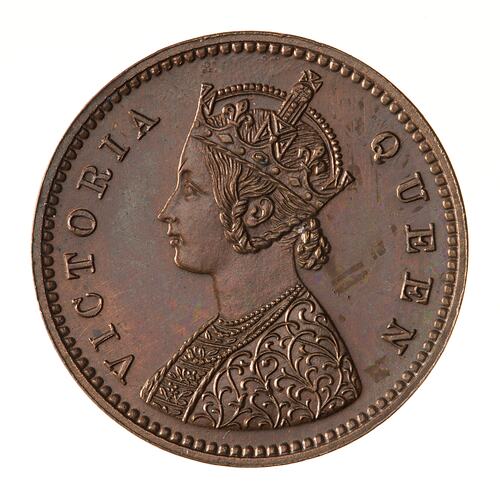 Crowned and robed bust of the queen facing left; around VICTORIA QUEEN (inverted V at centre of bust truncation)