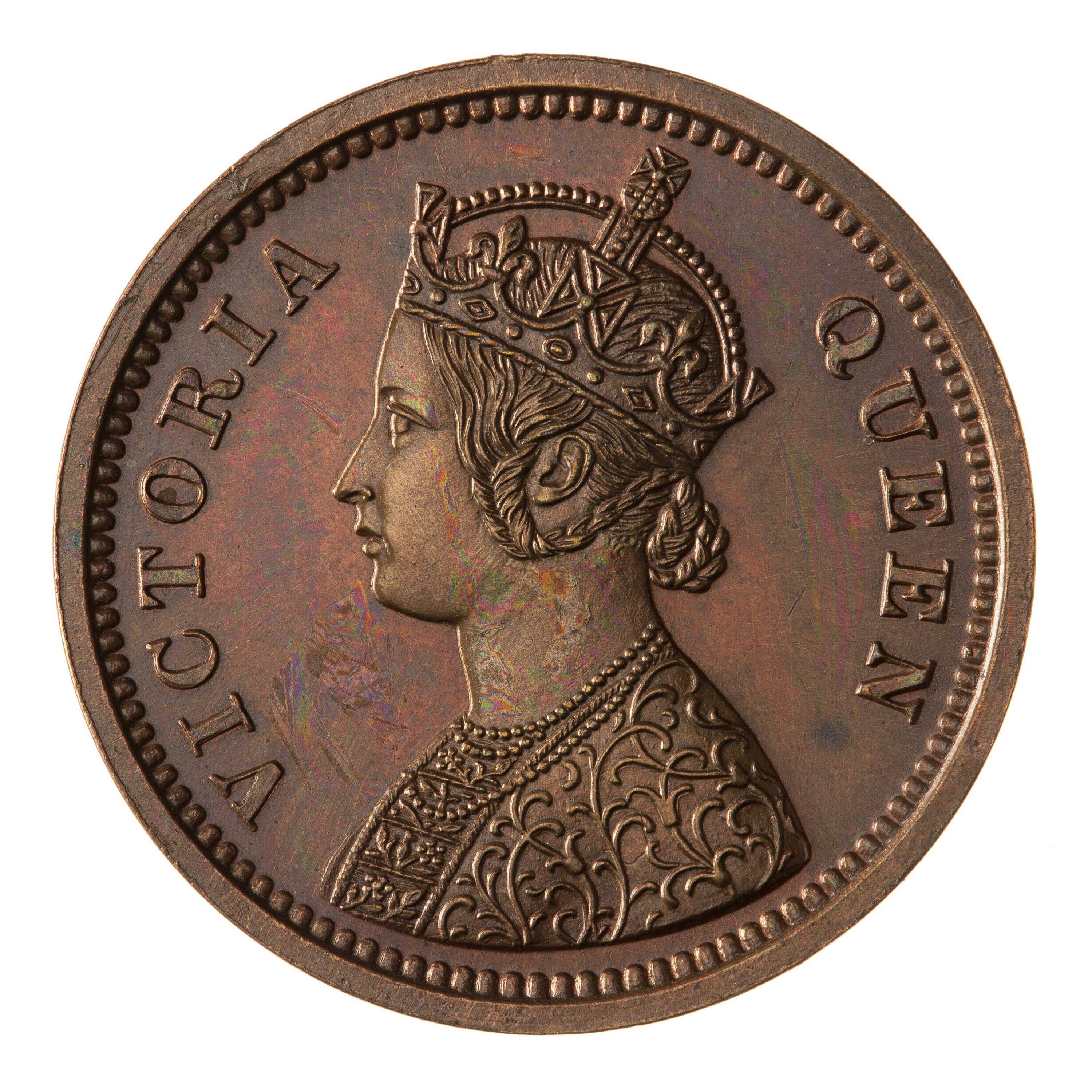 Crowned and robed bust of the queen facing left; around VICTORIA QUEEN (inverted V at centre of bust truncation)
