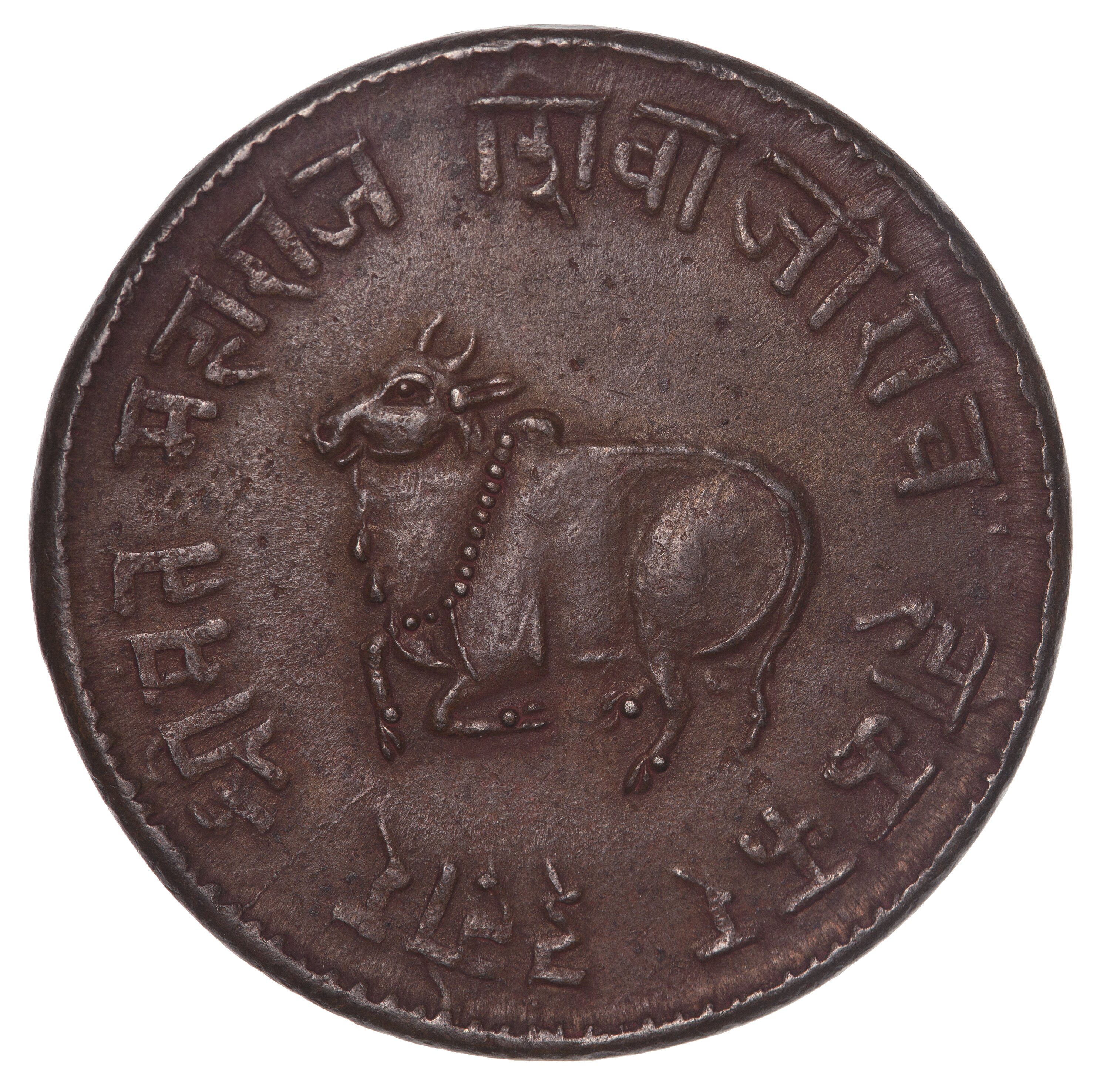 The arms of Indore includes an image of Nandi, the bull sacred to Shiva in a pose like that on this coin. The coin was issued by Shivaji Rao one of the Holkar rulers of Indore by whom Shiva was specially adored.
