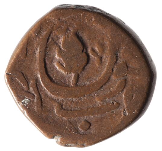 Near centre, a leaf within a Persian legend, mostly, including date, off flan; (Valentine gives the legend as Zarb Jamun sanbat (date))