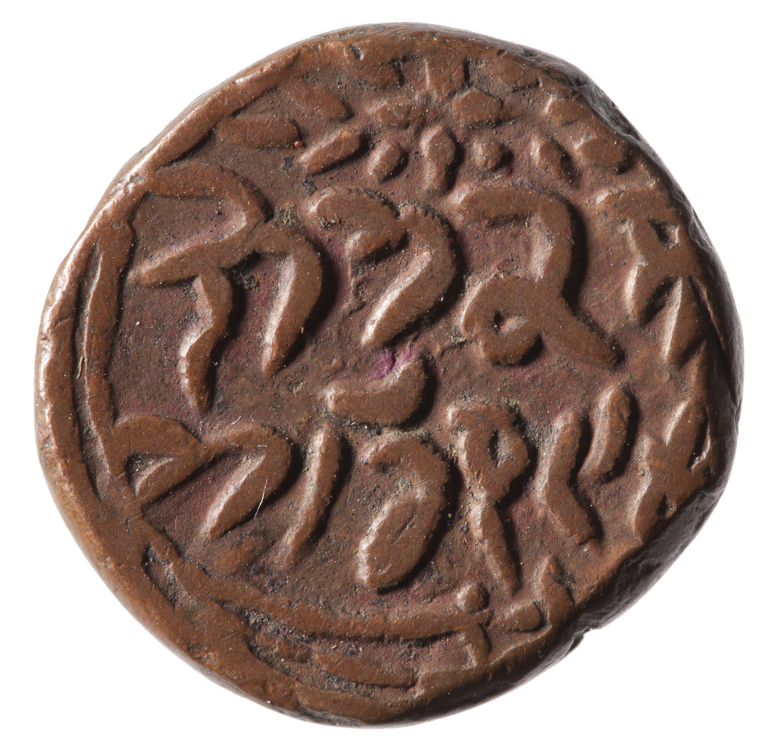 Near centre, a leaf within a Persian legend, mostly, including date, off flan; (Valentine gives the legend as Zarb Jamun sanbat (date))