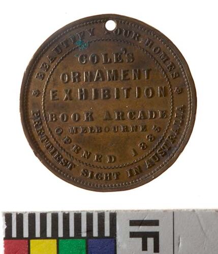 Obverse: COLE'S BOOK ARCADE FIRST OPENED IN THE WORLD 1875 A MILLION BOOKS TO CHOOSE FROM GET ALMOST ANY BOOK THERE Reverse: BEAUTIFY YOUR HOMES COLE'S ORNAMENT EXHIBITION BOOK ARCADE MELBOURNE OPENED 1885 PRETTIEST SITE IN AUSTRALIA