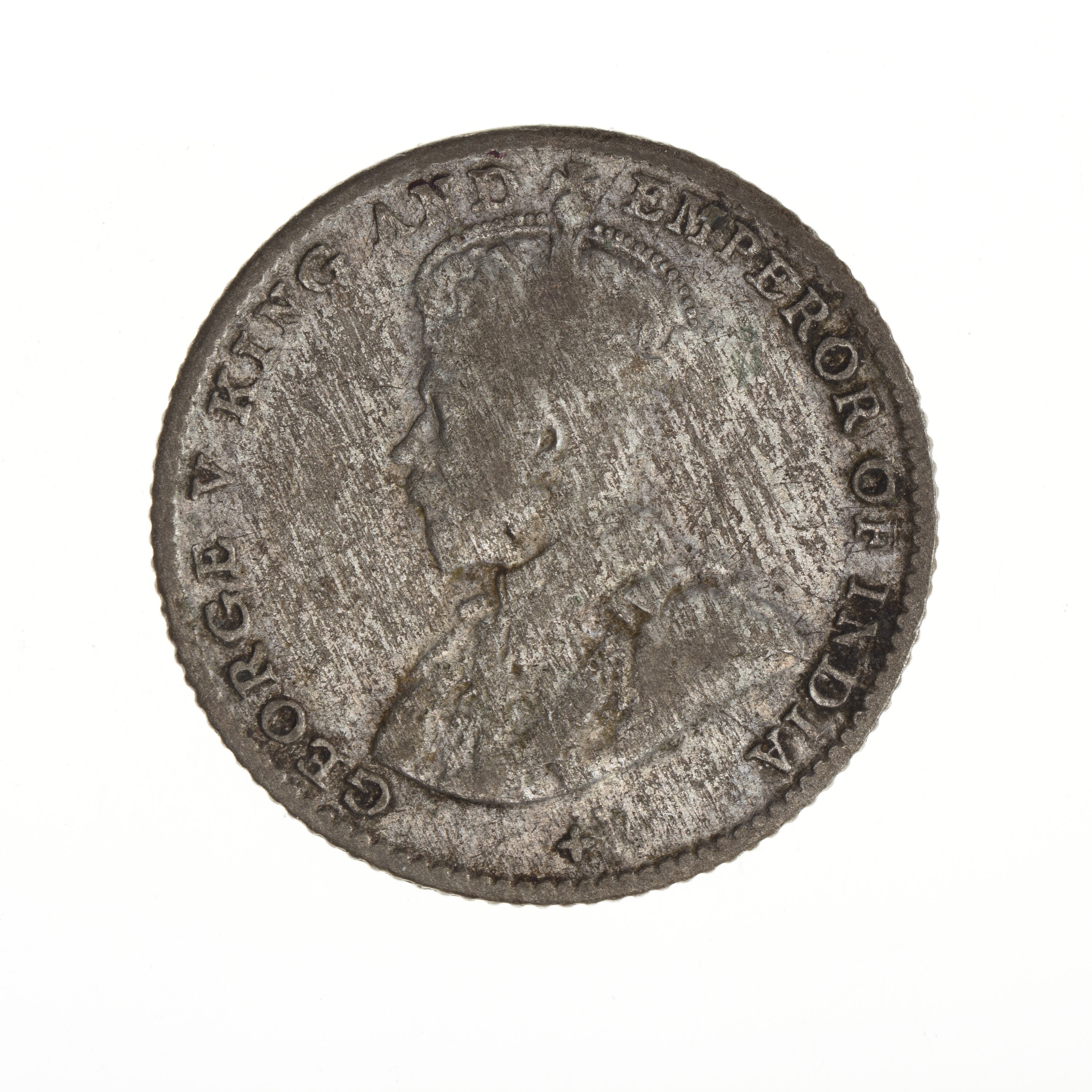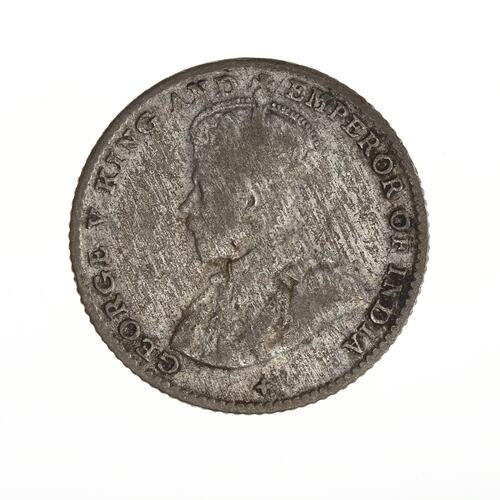Bust of the King wearing the Imperial crown and an ermine robe with the collar of the Garter; around, GEORGE V KING AND EMPEROR OF INDIA; the artist's initials BM on bust truncation