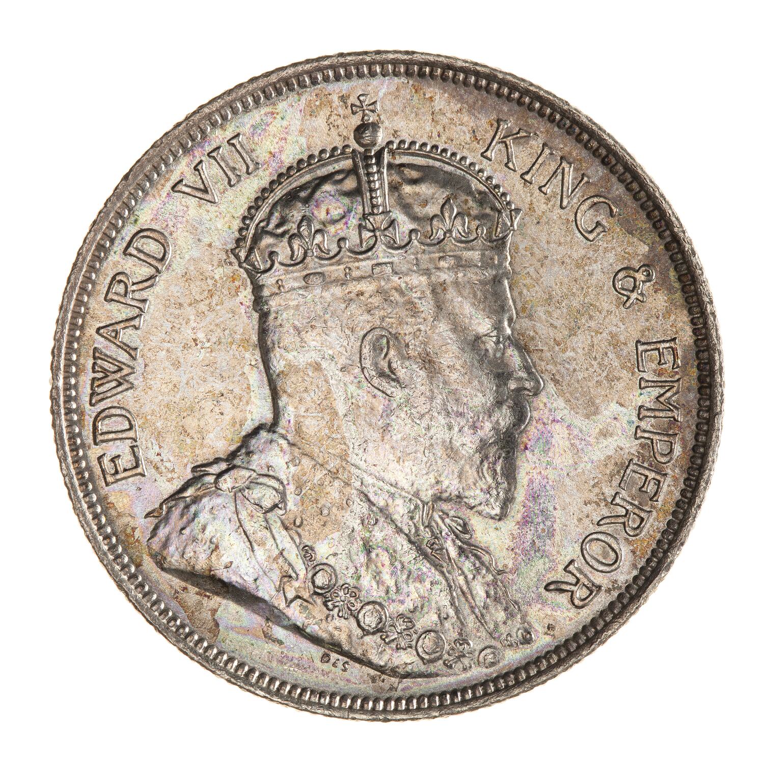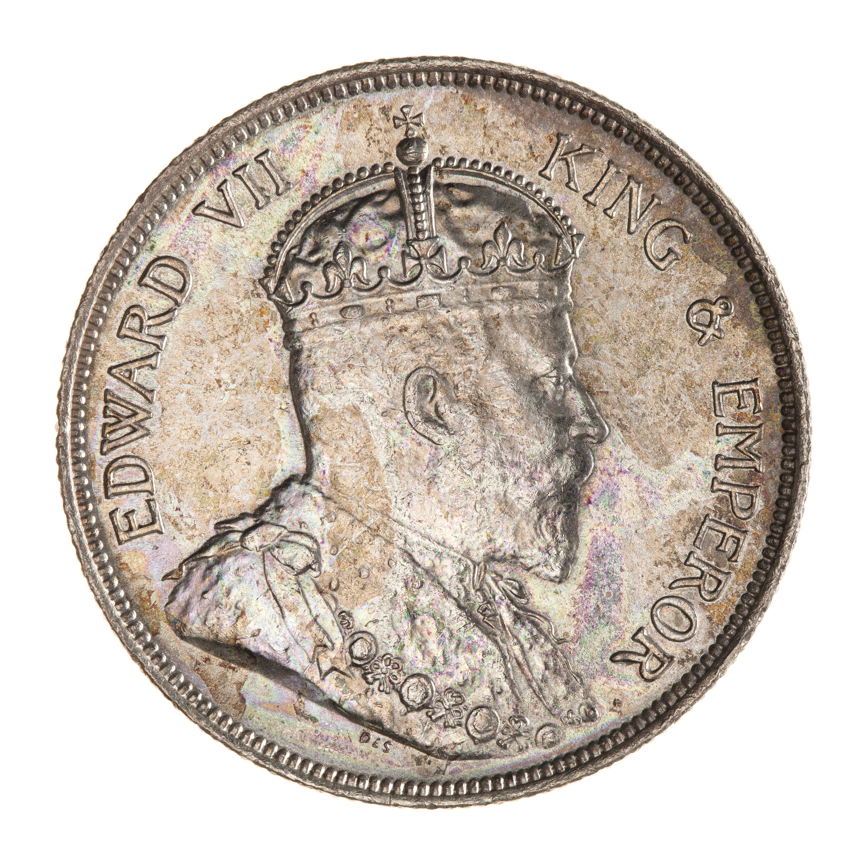 Bust of the King wearing the Imperial crown and an ermine Robe of State with the Collar of the Most Honourable Order of the Bath; around, EDWARD VII KING & EMPEROR; the artist's initials DES below bust