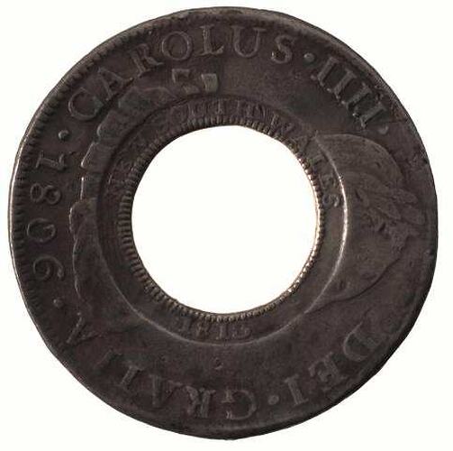 A ring shaped silver coin (40 mm diameter) manufactured by cutting a circular 'dump' from the centre of a Lima mint 8 real piece of 1806 and counterstamping the words NEW SOUTH WALES 1813 around the central hole on one side (the obverse) and the words FIVE + SHILLINGS on the other (the reverse) and a spray of leaves with the engraver's initial H. Obverse die : I/7. Reverse die: A/12 (Spalding 165).