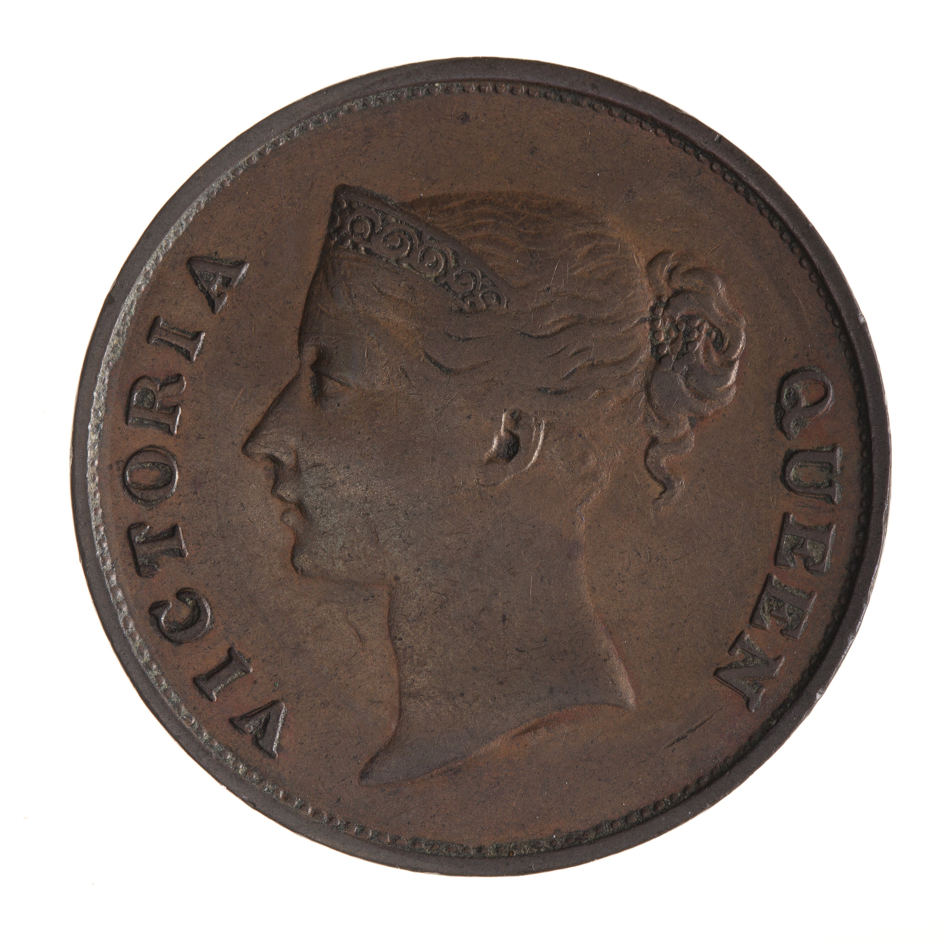 Head of the Queen wearing coronet or diadem ornamented with a scroll facing left; around, VICTORIA QUEEN. The ends of the coronet are connected by a band which is partly hidden by the hair. The hair is drawn into a knot decorated with beads behind the head