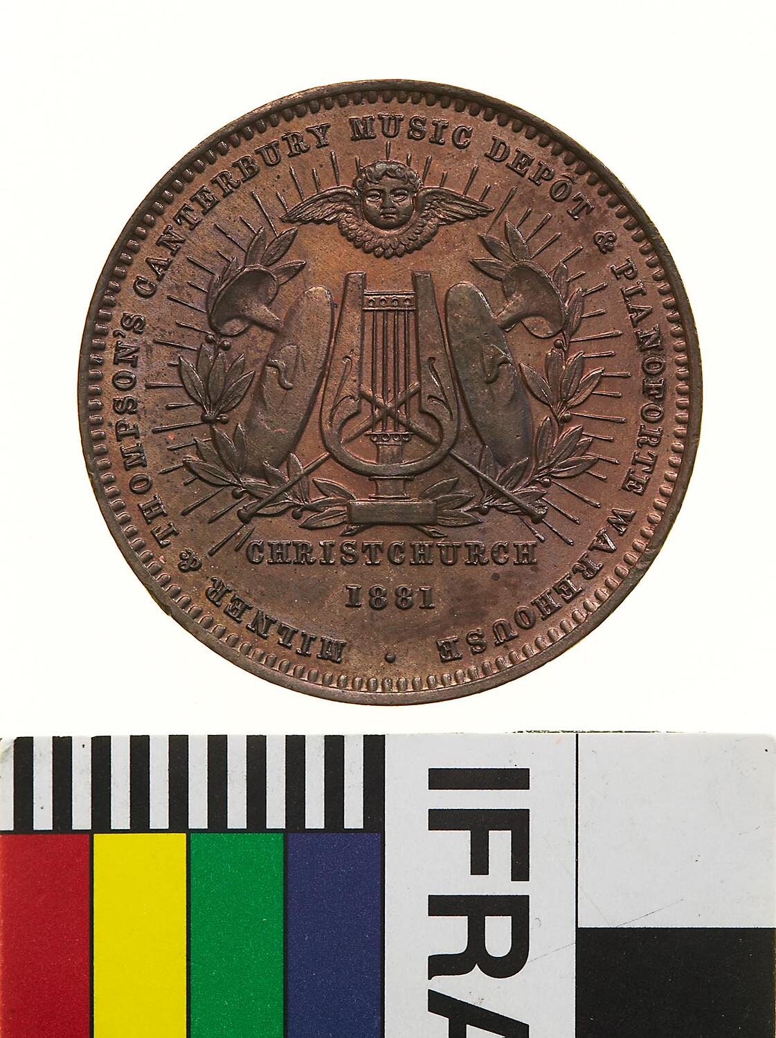Obverse: MILNER & THOMPSON CANTERBURY MUSIC DEPOT & PIANOFORTE WAREHOUSE CHRISTCHURCH 1881 Reverse: NEW ZEALAND